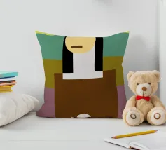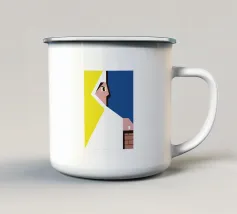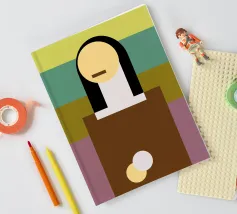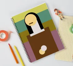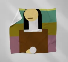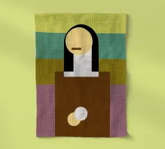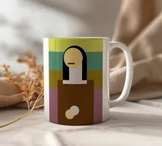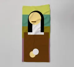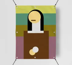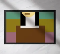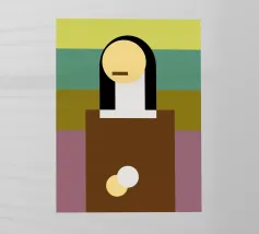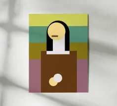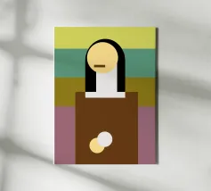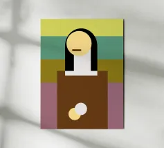 Un design minimalista è caratterizzato da forme geometriche e da una miscela di colori che formano una rappresentazione astratta di una figura. Lo sfondo è costituito da bande orizzontali di colore verde, giallo e viola.