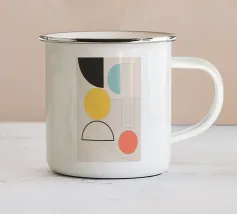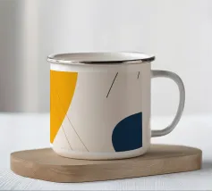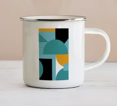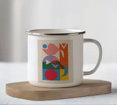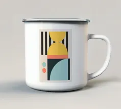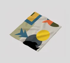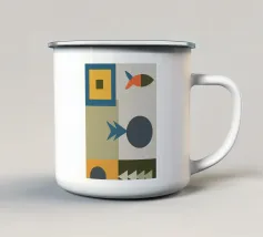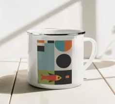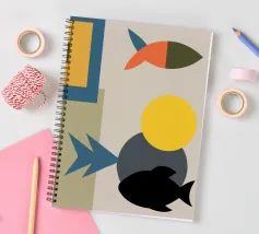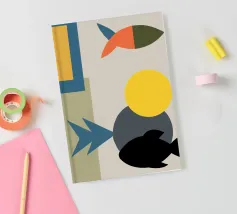 Su uno sfondo neutro sono disposte forme geometriche di vari colori, tra cui un cerchio giallo, un pesce nero e triangoli stratificati. Blocchi di colore verde, blu e arancione creano un contrasto vivace con le forme.