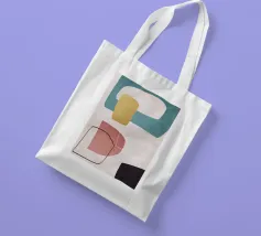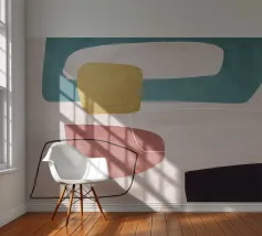 Forme geometriche astratte in morbide tonalità pastello si sovrappongono l'una all'altra, creando una composizione armoniosa. I contorni decisi e il mix di colori come il verde acqua, il giallo senape e il rosa polveroso aggiungono profondità al disegno.