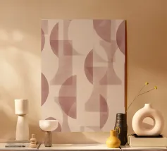 Il disegno presenta un'accattivante disposizione di cerchi, rettangoli e forme astratte di foglie sovrapposte, che alludono sottilmente a forme organiche all'interno della struttura. La texture granulosa aggiunge profondità e interesse visivo.