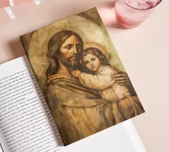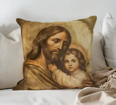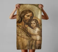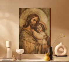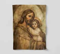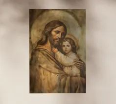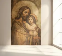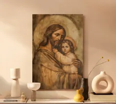 La toccante rappresentazione di Gesù Cristo che tiene in braccio un bambino simboleggia l'amore e la cura nella tradizione cristiana. Questa opera d'arte digitale cattura il legame spirituale tra Dio e l'umanità.