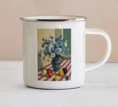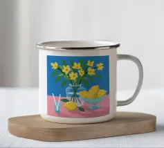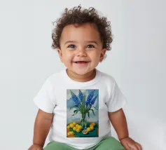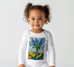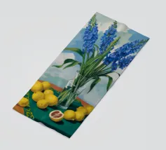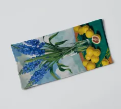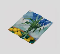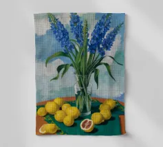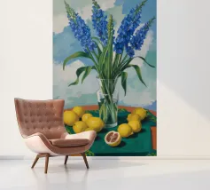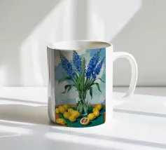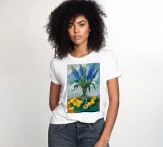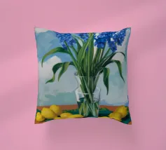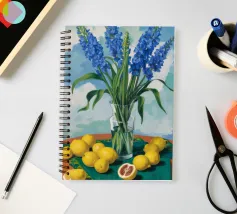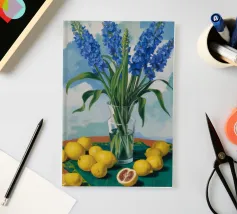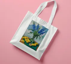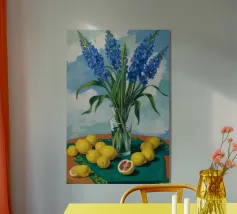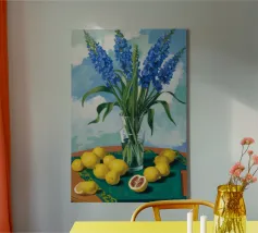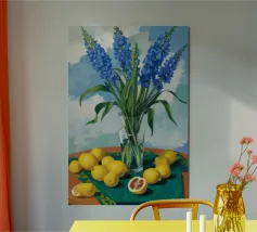 Una splendida natura morta di un bouquet di giacinti blu in un vaso di vetro trasparente, circondato da limoni e da un singolo fico tagliato. La composizione è elegante e fresca, con un'attenzione particolare alla bellezza naturale e ai dettagli delicati.