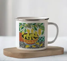 Una splendida natura morta di un bouquet di giacinti blu in un vaso di vetro trasparente, circondato da limoni e da un singolo fico tagliato. La composizione è elegante e fresca, con un'attenzione particolare alla bellezza naturale e ai dettagli delicati.