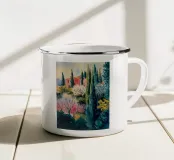 Una vivace scena di giardino è animata da colori, con alti cipressi, arbusti rosa in fiore e fiori blu, tutti dipinti in uno stile fauvista altamente espressivo che irradia energia e gioia.