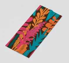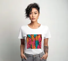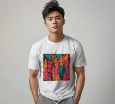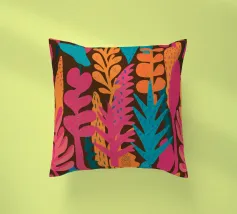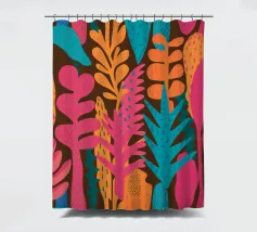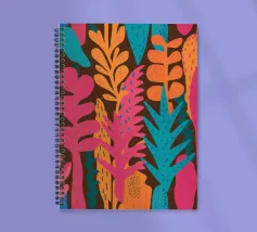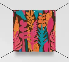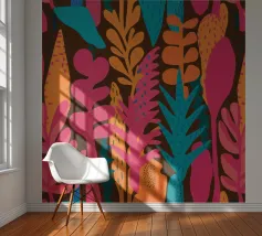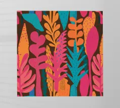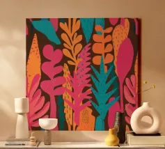 Una composizione verticale di forme botaniche astratte in una tavolozza calda e terrosa di rosa, terracotta e verde acqua. La crescita verso l'alto suggerisce un fiorente muro da giardino stilizzato.