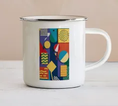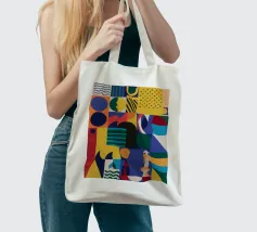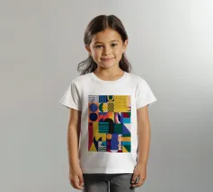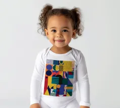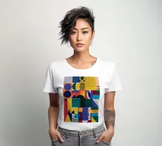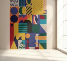 Una composizione astratta dinamica e giocosa è riempita da una varietà di forme geometriche, modelli e texture colorate, che creano un senso di celebrazione.