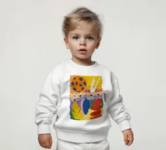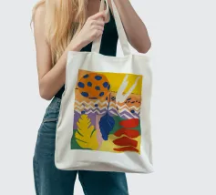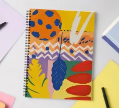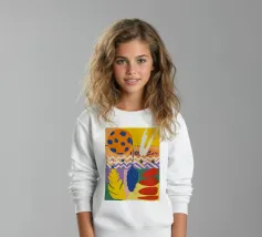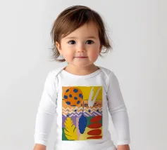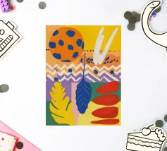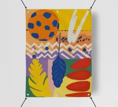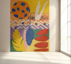 Un'opera astratta giocosa ed energica che combina motivi geometrici a zig zag, pois e forme botaniche stilizzate in una vivace combinazione di colori arancione, blu e viola.