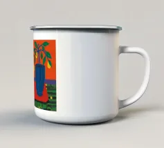 Un'opera astratta giocosa ed energica che combina motivi geometrici a zig zag, pois e forme botaniche stilizzate in una vivace combinazione di colori arancione, blu e viola.