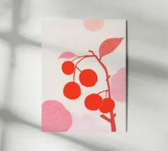 Questo moderno murale mostra ciliegie stilizzate di colore rosso vivo su un ramo graficamente disegnato con foglie e texture delicate di colore rosa. La combinazione di accenti cromatici decisi e texture raffinate crea un gioco armonioso di freschezza ed eleganza. La rappresentazione minimalista nei toni pastello e rossi rende questo motivo un richiamo ideale per la cucina, la sala da pranzo o il soggiorno creativo.