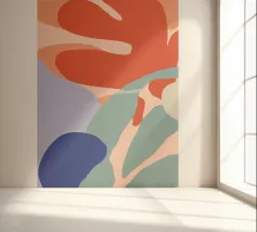 Una composizione astratta ispirata a Maraoui, con forme semplici e ritagliate in colori primari come il rosso, il blu e l'arancione su un morbido sfondo color lavanda. L'opera d'arte è al tempo stesso giocosa e sofisticata.