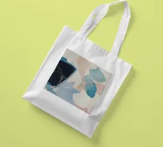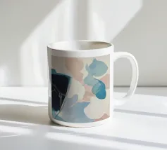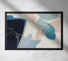 Un'opera astratta con grandi forme simili a foglie in blu e verde tenui, sovrapposte a forme più chiare in beige e crema, che creano un sottile gioco di ombre e un senso di profondità organica. Stile Melissa Herrington.