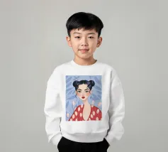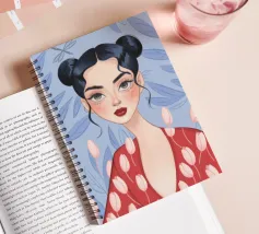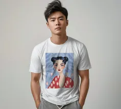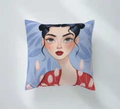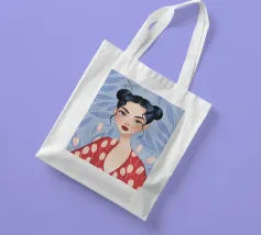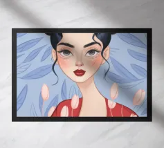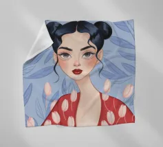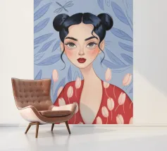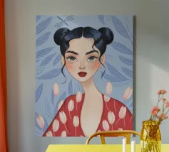 Questa opera d'arte raffigura una persona con due chignon, vestita con un abito rosso e bianco a motivi floreali. Lo sfondo blu con foglie bianche aggiunge un fascino allegro e stravagante.