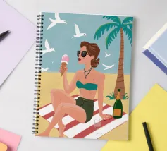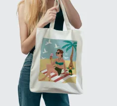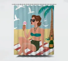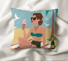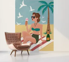 Illustrazione di una donna in costume da bagno elegante e cappello da sole, che si rilassa sulla spiaggia con una bottiglia di champagne. La scena è una rappresentazione chic, lussuosa e idilliaca di una perfetta giornata di festa in spiaggia.