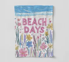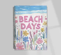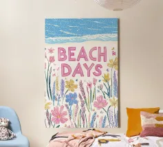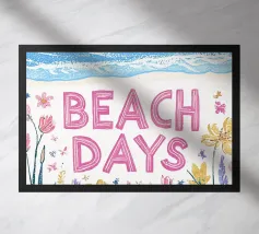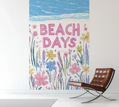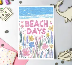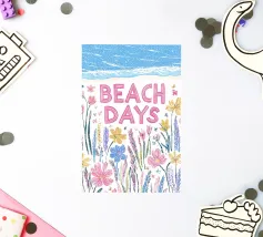 "Beach Days" - Un allegro motivo estivo che celebra la gioia di viaggiare e rilassarsi sulla spiaggia con accenti botanici dai colori pastello. Perfetto per un poster estivo che trasmette uno stato d'animo vacanziero e la gioia del giardinaggio!
