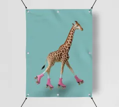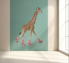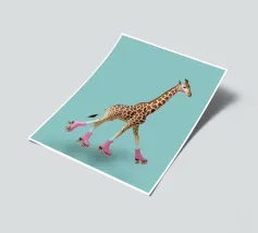 Fate una dichiarazione audace e contemporanea con questa sorprendente stampa animale Pop Art, "Roller Giraffe". Questo pezzo accattivante presenta una maestosa giraffa realistica a metà della sua corsa, mostrando un incredibile equilibrio e stile. L'opera d'arte è caratterizzata da un elevato contrasto e da un'estrosità moderna, con la giraffa che indossa con sicurezza pattini a rotelle rosa acceso e calzini sportivi a righe. Questo poster di giraffa stravagante di alta qualità è ideale per i collezionisti di fotografie di animali unici e di arte digitale contemporanea.