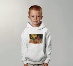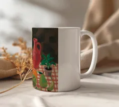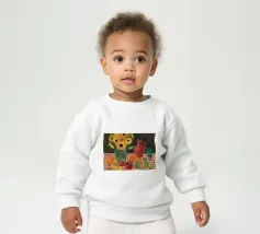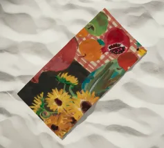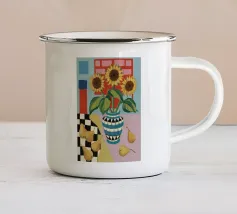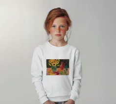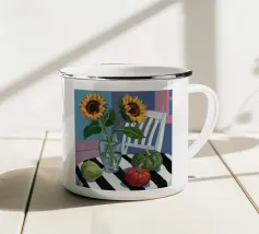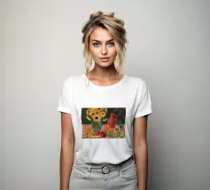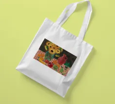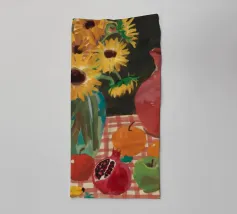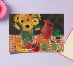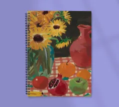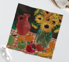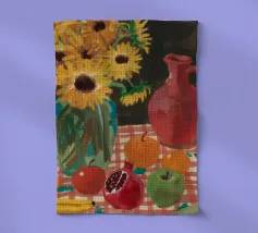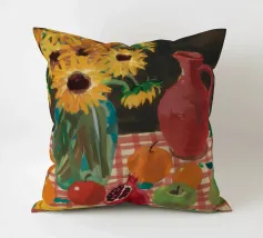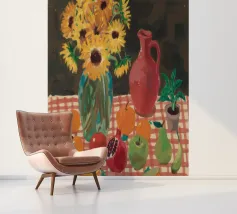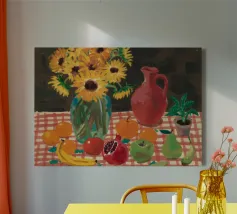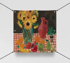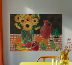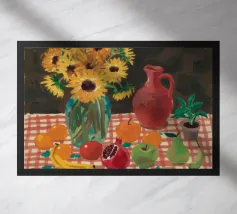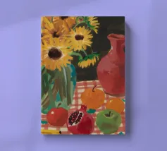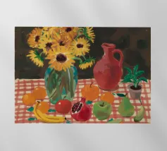 Una classica e calda natura morta di un bouquet di girasoli in una brocca rossa. Sul tavolo sono disposti melograni e mele e l'intera scena è immersa in una calda luce dorata su uno sfondo scuro.