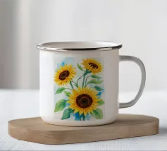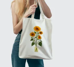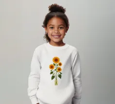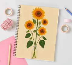 L'immagine mostra un'illustrazione di tre girasoli in un vaso. I petali arancione brillante e i centri marroni maculati conferiscono ai fiori un aspetto caldo e vivace. Gli steli e le foglie verdi sono disegnati in modo dettagliato e fedele alla realtà. Lo stile è botanico e realistico, con linee pulite e colori decisi che evidenziano la bellezza e la struttura dei girasoli. Un gioco armonioso di dettagli e intensità di colore!