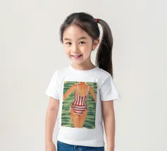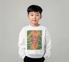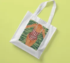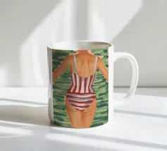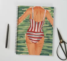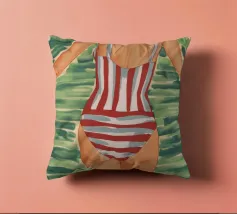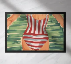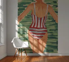 Una vista posteriore di una donna in costume da bagno a righe bianche e rosse, su uno sfondo verde tenue, che evoca un'atmosfera vintage o retrò da vacanza al mare, con un'attenzione particolare a un momento estivo senza tempo.