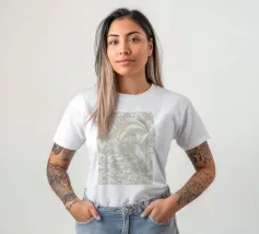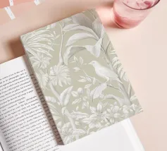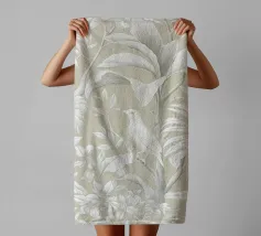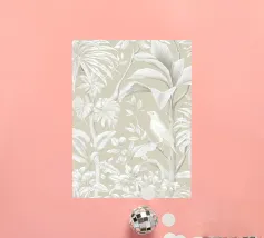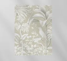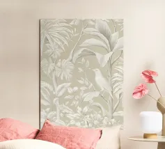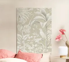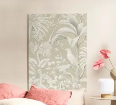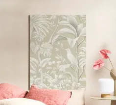 Questo quadro, che ricorda l'eleganza delle illustrazioni botaniche storiche e le linee sottili dell'Art Nouveau, trasporta lo spettatore in un mondo di tranquilla bellezza. La tavolozza di colori monocromatici, con toni morbidi di grigio e beige, crea un'atmosfera rilassante in cui un delicato uccello si nasconde tra lussureggianti foglie tropicali. Ogni foglia e piuma è disegnata con meticolosa precisione, conferendo al motivo una consistenza quasi tangibile. È un'opera d'arte senza tempo che emana calma e raffinatezza, aggiungendo un'aura di naturale eleganza a qualsiasi ambiente.
