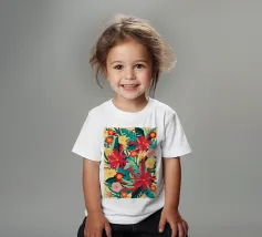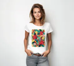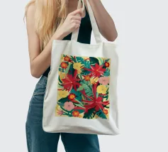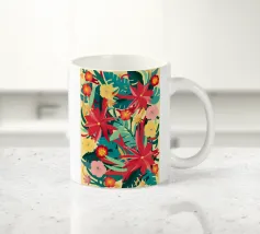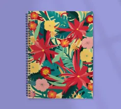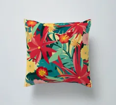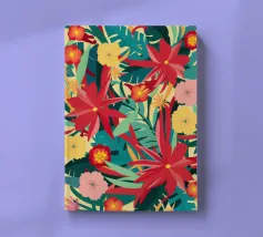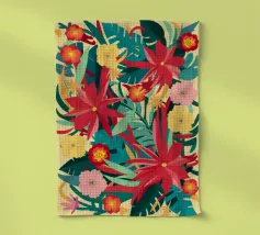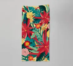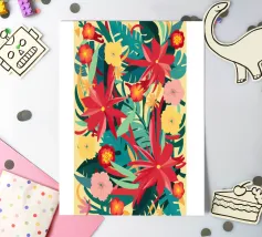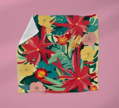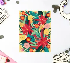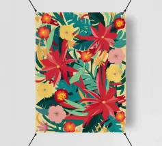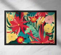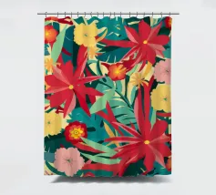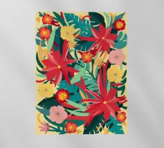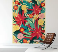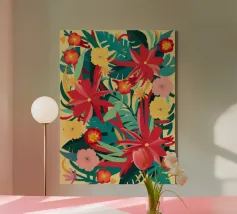 Un lussureggiante disegno di fiori tropicali, dominato da vibranti fiori cremisi e rosa con foglie verdi, crea una scena di giungla ricca, appassionata e bellissima.