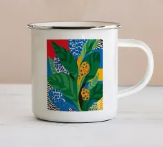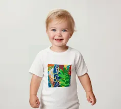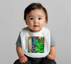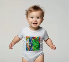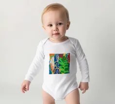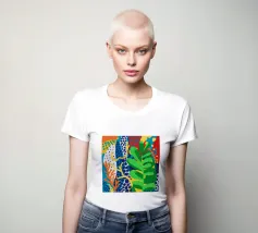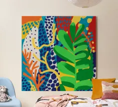 Un'esplosione di botaniche astratte e motivi dinamici in verdi, blu e arancioni vibranti, che ricordano una giungla densa e illuminata dal sole. La composizione è un vivace arazzo di colori e forme.
