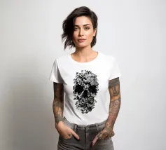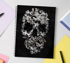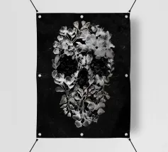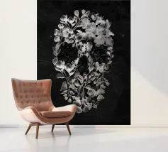 Una suggestiva illustrazione di teschio formata da delicati fiori e foglie di vetro. Il contrasto tra le botaniche chiare e lo sfondo scuro crea un disegno inquietante ma elegante, che simboleggia l'equilibrio tra la vita e la morte. Un'opera d'arte da parete perfetta per gli amanti delle decorazioni floreali, gotiche e surreali.