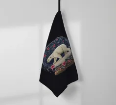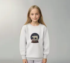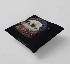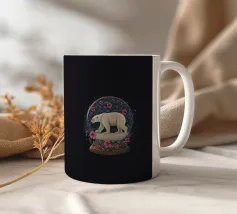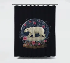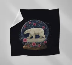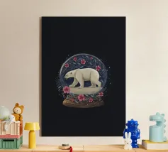 Un orso polare bianco che viaggia in una vorticosa sfera di neve floreale circondata da fiori rosa, stelle scintillanti e rami botanici blu. Ispirato alla vita degli orsi polari canadesi vicino alla tundra aperta e all'aria artica della Baia di Hudson.