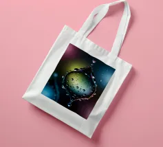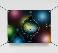 Delicate gocce d'acqua pendono elegantemente a mezz'aria, riflettendo vari colori dallo sfondo dolcemente sfocato, evocando un senso di meraviglia e bellezza.