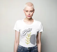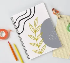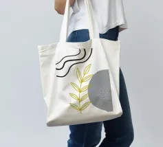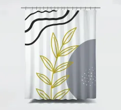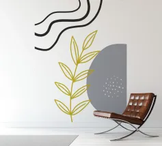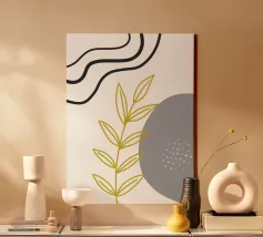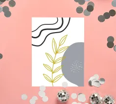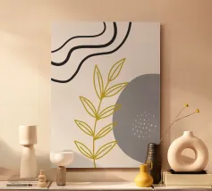 Il design minimalista è caratterizzato da un ramo in foglia d'oro e da forme astratte in nero e grigio. Un cerchio grigio punteggiato aggiunge un tocco di consistenza ed equilibrio.