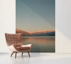 Le maestose cime dell'Eiger, del Mönch e della Jungfrau risplendono nella calda luce della sera, mentre il lago di Thun riflette i colori tenui del tramonto. Una scena tranquilla dell'Oberland bernese, catturata in una tranquilla serata di primavera con una vista limpida e la luna crescente.
