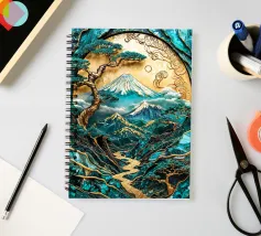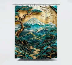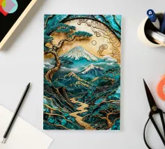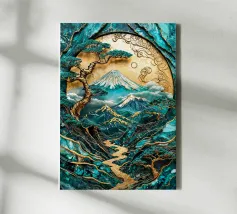 Il monte Fuji si erge maestoso, circondato da vorticosi toni oro e giada. Questa opera d'arte ispirata al kintsugi fonde paesaggi giapponesi con fiumi che scorrono e alberi sacri, creando una visione serena e senza tempo dell'armonia della natura.