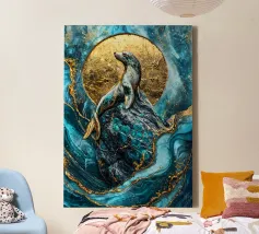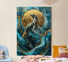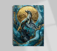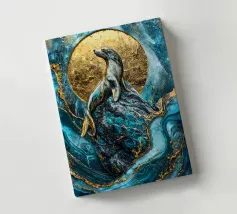 Un maestoso leone marino si crogiola nella luce celeste, la sua forma è ornata da venature dorate kintsugi che si intrecciano con il blu vorticoso dell'oceano. Poggiato su una roccia strutturata, diventa un simbolo vivente della resilienza e dell'armonia della natura.