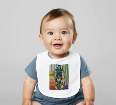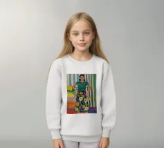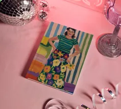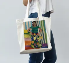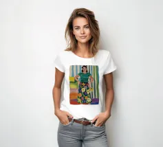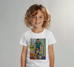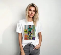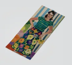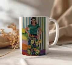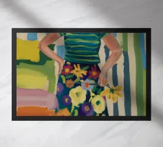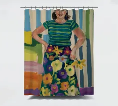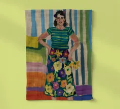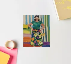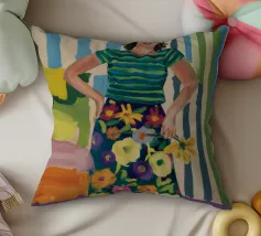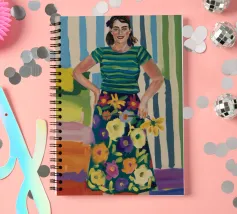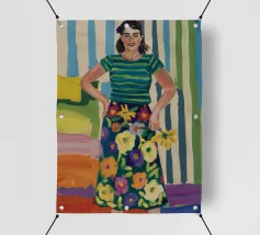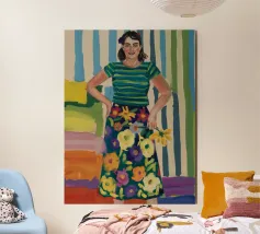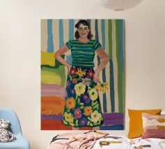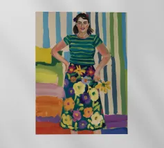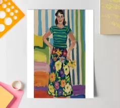 Ritratto a figura intera di una donna elegante e sicura di sé, che abbina un top a righe verdi a una vivace gonna floreale colorata. La sua posa con le mani sui fianchi emana un'energia moderna, chic e sicura di sé.