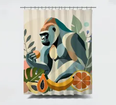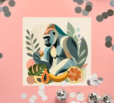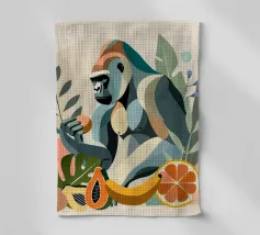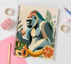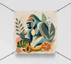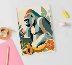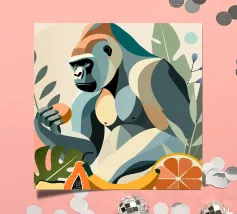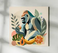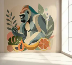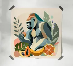 Un potente gorilla tra frutti e piante tropicali, circondato da un'armoniosa tavolozza di colori. Questa illustrazione cattura l'essenza della natura e della fauna selvatica, presentando il maestoso animale con arance, banane ed elementi esotici. Perfetta per progetti che celebrano la bellezza della fauna selvatica e della natura.Illustrazione dettagliata: potente gorilla con elementi tropicali.