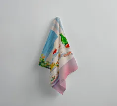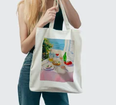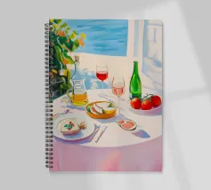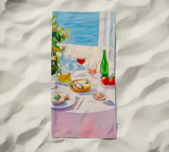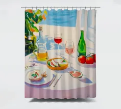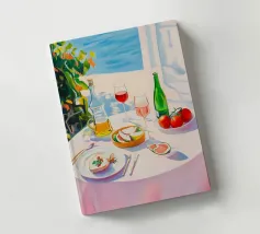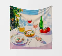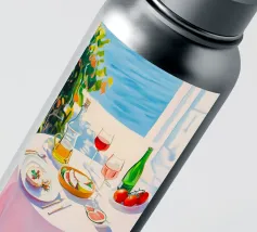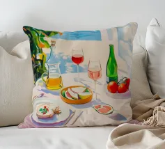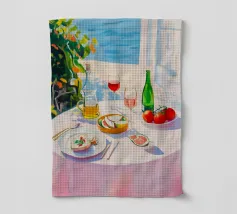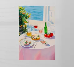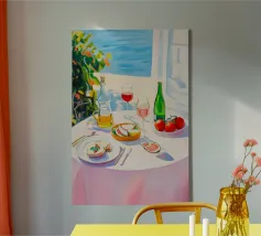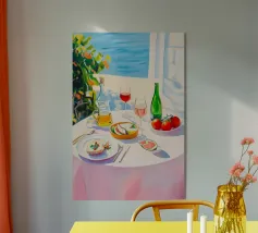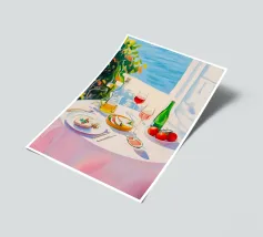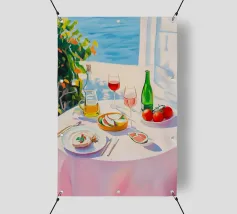 Vivace terrazza estiva, dove un tavolo è imbandito con limonata e vino fresco nelle vivaci tonalità del rosa, del verde, dell'arancio e del giallo. L'allegra composizione trasmette la sensazione rinfrescante di una calda giornata estiva e, con una piccola pianta verde e dei pomodori, crea un'invitante atmosfera mediterranea, ideale per l'arte murale estiva.