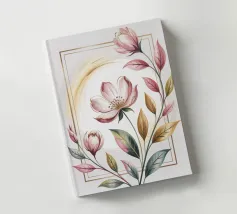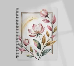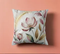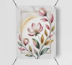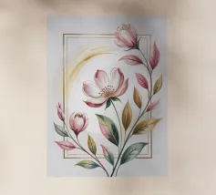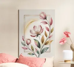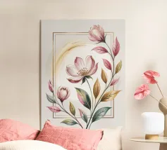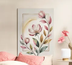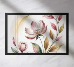Una raffinata composizione floreale che celebra la tranquilla eleganza. Questa stampa botanica dipinta a mano presenta fiori rosa tenue e foglie dorate incorniciate da linee delicate: un pezzo senza tempo per elevare qualsiasi interno moderno.