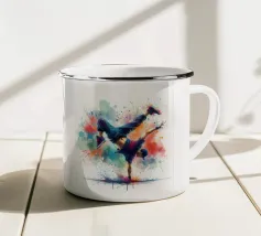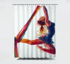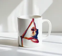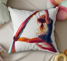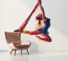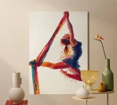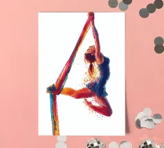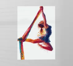 Questa colorata raffigurazione mostra una donna in una posa elegante durante un'esibizione di acrobazia aerea con sciarpe. La donna si aggrappa alle sciarpe dai colori vivaci con entrambe le braccia, mentre il suo corpo adotta una postura espressiva e dinamica. La sua posa trasmette leggerezza, forza e grazia allo stesso tempo. Le esplosioni di colore intorno alla figura rafforzano la sensazione di movimento e di espressione artistica. Lo sfondo è mantenuto in bianco puro, ponendo il soggetto in primo piano e concentrandosi interamente sull'acrobata.