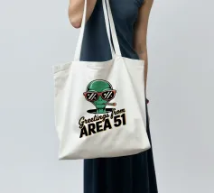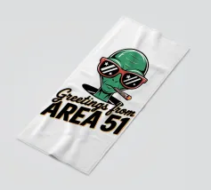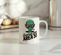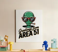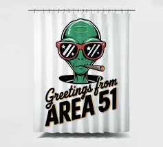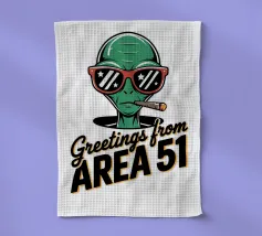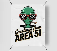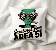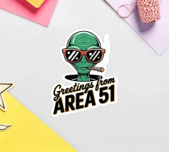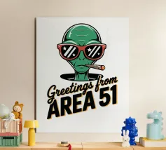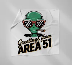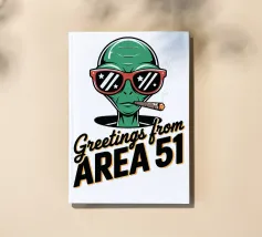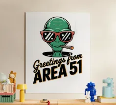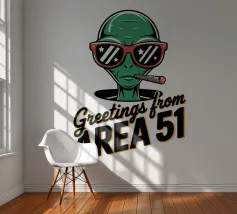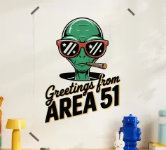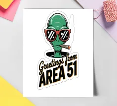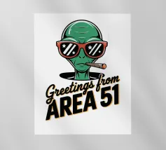 Un personaggio alieno verde che indossa occhiali da sole rossi e fuma un sigaro è raffigurato sopra la scritta "Greetings from Area 51". Il disegno mescola umorismo e temi extraterrestri.