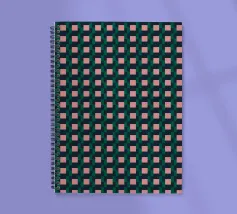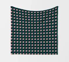 Un motivo ripetitivo di quadrati blu scuro e rosa crea una griglia geometrica, dando un senso di profondità e ritmo. I colori alternati formano un effetto a scacchiera che conduce l'occhio in più direzioni.