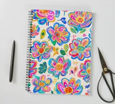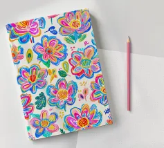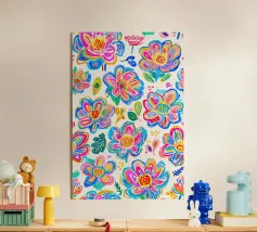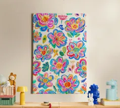 Stravagante motivo floreale a scarabocchi con spesse linee di disegno grezze e blocchi di colore vibranti. Questo audace disegno floreale è caratterizzato da un'espressione cruda e da una sfida giocosa, che unisce la spontaneità della street-art a un senso di chiarezza grafica.