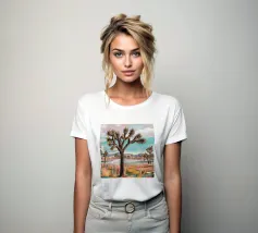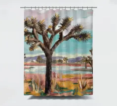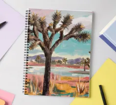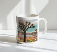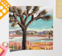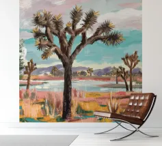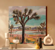 Due alberi di Joshua si ergono orgogliosi in una scena desertica color pastello, trasudando equilibrio e resistenza senza tempo.
