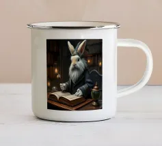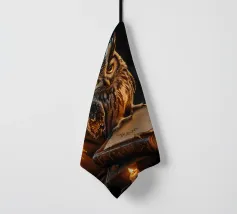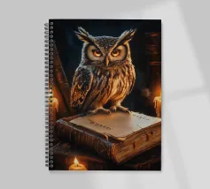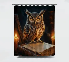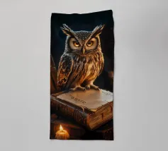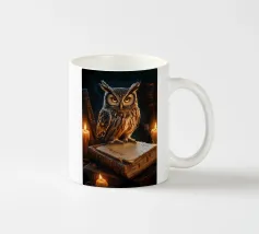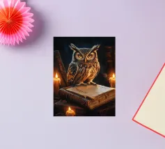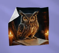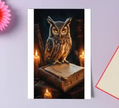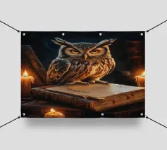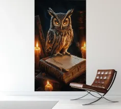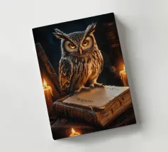 Questa suggestiva opera d'arte trasporta lo spettatore in una scena che ricorda una vecchia biblioteca o la stanza di un mago. Al centro, un gufo dipinto in modo ricco di dettagli siede su una pila di vecchi libri con uno sguardo penetrante. Attorno ad esso ardono diverse candele, la cui luce calda crea un emozionante contrasto con l'oscurità dell'ambiente circostante. Il gufo, simbolo di saggezza e conoscenza, sembra vegliare su un antico segreto o preservare una storia nascosta.