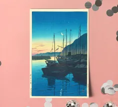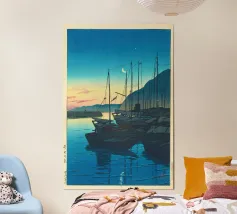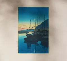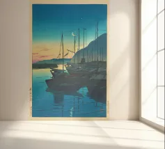 Hasui Kawase - Ochtend in Beppu (Mattino a Beppu): Una serena stampa su xilografia shin-hanga che cattura la tranquilla bellezza del primo mattino a Beppu, in Giappone. La luce soffusa, la leggera nebbia e la delicata gestione dell'atmosfera da parte di Kawase creano una scena piena di pace e raffinatezza. Kawase, uno dei più celebri stampatori giapponesi del XX secolo, ha saputo fondere le tecniche tradizionali dell'ukiyo-e con il realismo moderno, producendo opere che incarnano sia la tradizione culturale che l'eleganza senza tempo. Quest'opera è una stampa d'arte o un poster perfetto per i collezionisti di arte giapponese o per chi cerca un arredamento tranquillo.