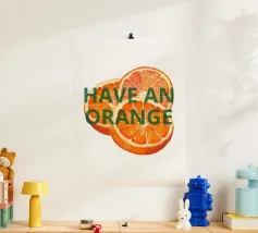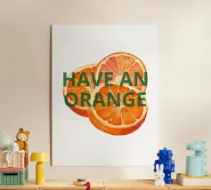 Fette di arance vivaci sono raffigurate con la scritta "HAVE AN ORANGE" sovrapposta in grassetto verde. Il frutto ha un aspetto fresco e succoso su un semplice sfondo bianco.