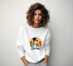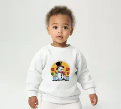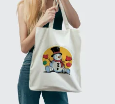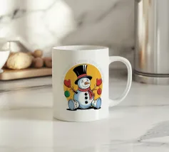 Un allegro pupazzo di neve vestito con cappello a cilindro e sciarpa tiene in mano palloncini colorati a forma di cuore. La scritta "Have Yourself a Merry Little Christmas". La scena evoca uno spirito festivo e gioioso.