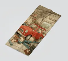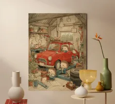 In un garage illuminato dal sole e pieno di fiori, una squadra di piccoli ricci lavora con gioia su un'auto d'epoca rosso brillante. Ogni dettaglio, dagli attrezzi sparsi alle piante in fiore, racconta una storia di lavoro di squadra, cura e fascino. Questa commovente illustrazione cattura un mondo stravagante di meccanica del bosco, perfetto per le stanze dei bambini o per l'arredamento di una casa accogliente. Una celebrazione della creatività, della nostalgia e delle piccole avventure.
