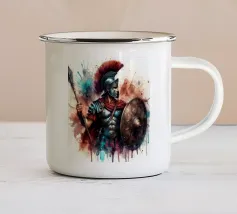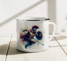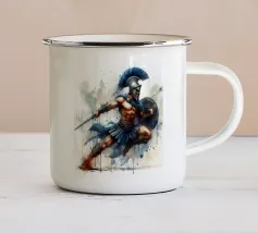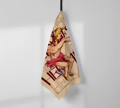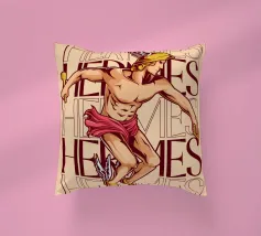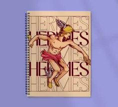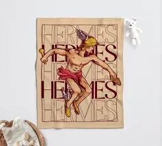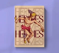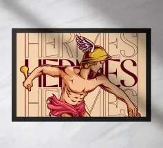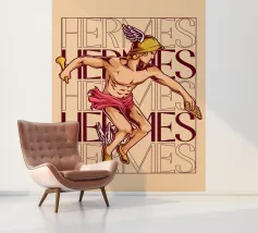 Hermes è raffigurato in corsa, con un elmo alato e sandali alati. Nelle mani tiene un bastone e una zampogna. Sullo sfondo compare più volte il suo nome, sottolineando il suo movimento e la sua velocità. La sua posa appare agile e determinata.
