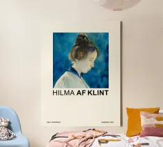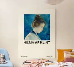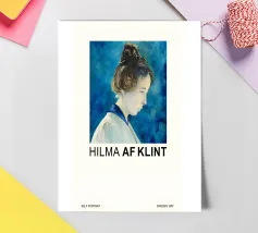 Questa straordinaria stampa d'arte presenta un classico autoritratto di Hilma af Klint, probabilmente del 1907, che la ritrae di profilo con i capelli ordinatamente acconciati all'insù. Il ritratto è reso con un'espressione riflessiva e un uso sottile del colore, su uno sfondo blu vibrante e strutturato che suggerisce un'aura eterea o un'energia spirituale. Questo pezzo offre un raro sguardo sull'artista che si cela dietro le pionieristiche opere astratte. Questo poster digitale di alta qualità (7000x5000 pixel, 300 dpi) cattura magnificamente la tranquilla intensità e la presenza artistica di Klint, rendendolo un'aggiunta unica e stimolante.