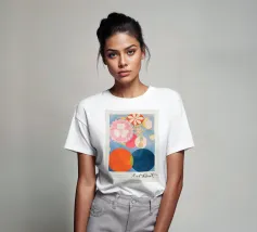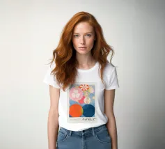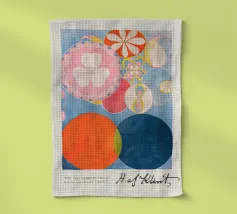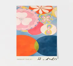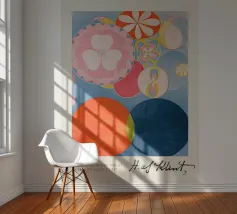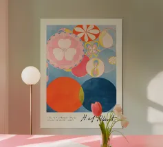 Questa accattivante stampa d'arte presenta "The Ten Largest (No.2)" di Hilma af Klint, una vibrante opera astratta del 1907. Su un sereno sfondo blu, la composizione è piena di grandi cerchi sovrapposti e forme floreali in una tavolozza di arancioni, rosa, gialli e blu, che creano un senso di crescita e di energia giocosa. Firmata "H. af Klint", quest'opera mostra la visione spirituale e astratta pionieristica di Klint, che esplora i temi degli inizi della vita. Questo poster digitale di alta qualità (7000x5000 pixel, 300 dpi) cattura magnificamente l'eterea bellezza e la rivoluzionaria arte di Klin
