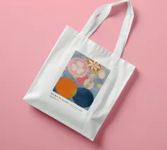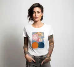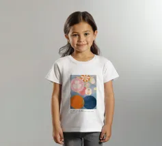 Questo accattivante poster della mostra presenta "The Ten Largest, No. 2, Childhood - 1907" di Hilma af Klint, una vibrante opera astratta su un sereno sfondo blu. La composizione è piena di grandi cerchi sovrapposti e forme floreali in una tavolozza di arancioni, rosa, gialli e blu, che creano un senso di crescita e di energia giocosa. Quest'opera mostra la visione spirituale e astratta pionieristica di Klint, che esplora i temi dell'inizio della vita. Il poster pubblicizza la mostra "Hilma af Klint - Artista, ricercatrice, medium". Questo poster digitale di alta qualità (7000x5000 pixel, 300 dpi)
